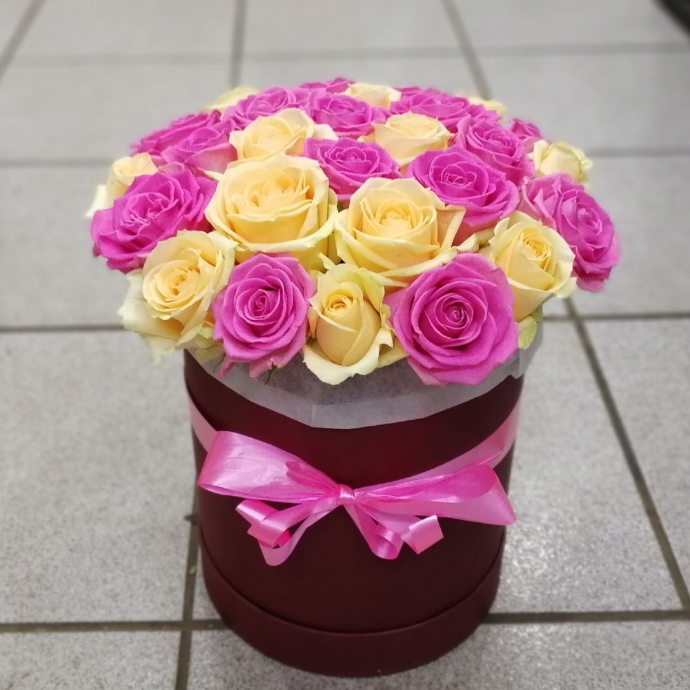 На фото - Букет из 25 микс роз в коробке. В составе данной композиции: Роза - 25 шт.; Коробка шляпная - 1 шт.; Фетр - 1 шт.; Лента - 1 шт..