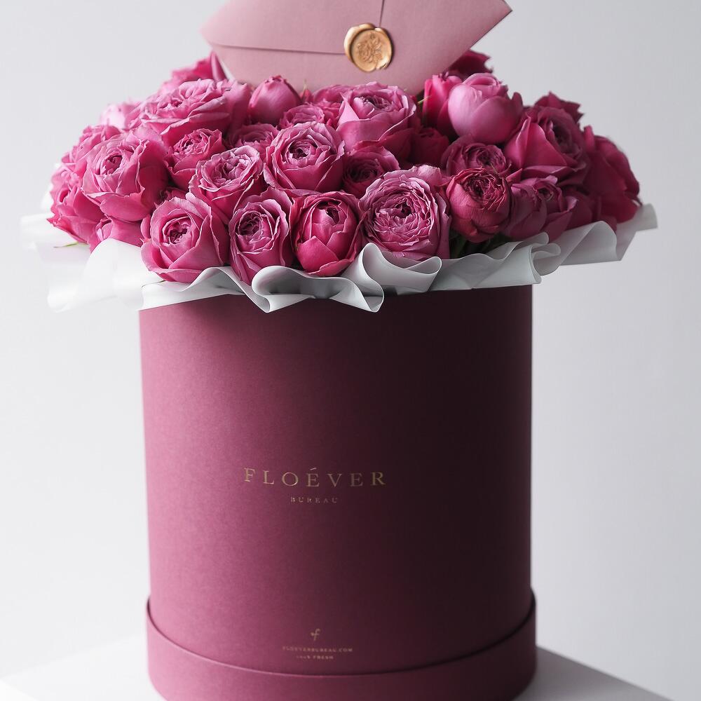У нас можно заказать Букет из роз Мисти Бабблз в бордовой шляпной коробке XL с доставкой по Москве.