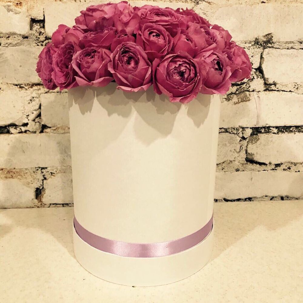 На фото - Букет ПАВЛОВА. В составе данной композиции: Роза кустовая фиеста баблс - 25 шт.; Лента - 1 шт.; Шляпная коробка - 1 шт.; Фетр - 1 шт..
