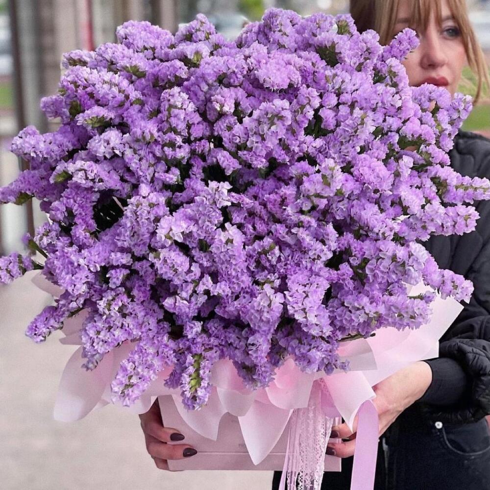 На фото - Букет "Ля Флер". В составе данной композиции: Статица - 45 шт.; Коробка - 1 шт.; Упаковка - 1 шт.; Лента - 1 шт..