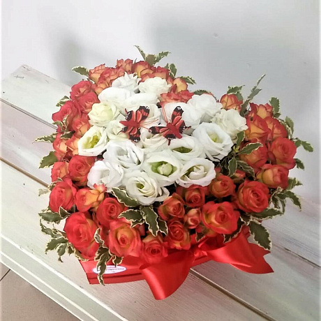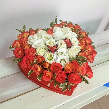 На фото - Букет "Сердце из цветов". В составе данной композиции: Кустовая роза - 20 шт.; Лизиантус - 5 шт.; Питтоспорум - 1 шт.; Коробка сердце - 1 шт.; Оазис - 2 шт.; Лента атласная - 1 шт.; Бабочка - 2 шт..