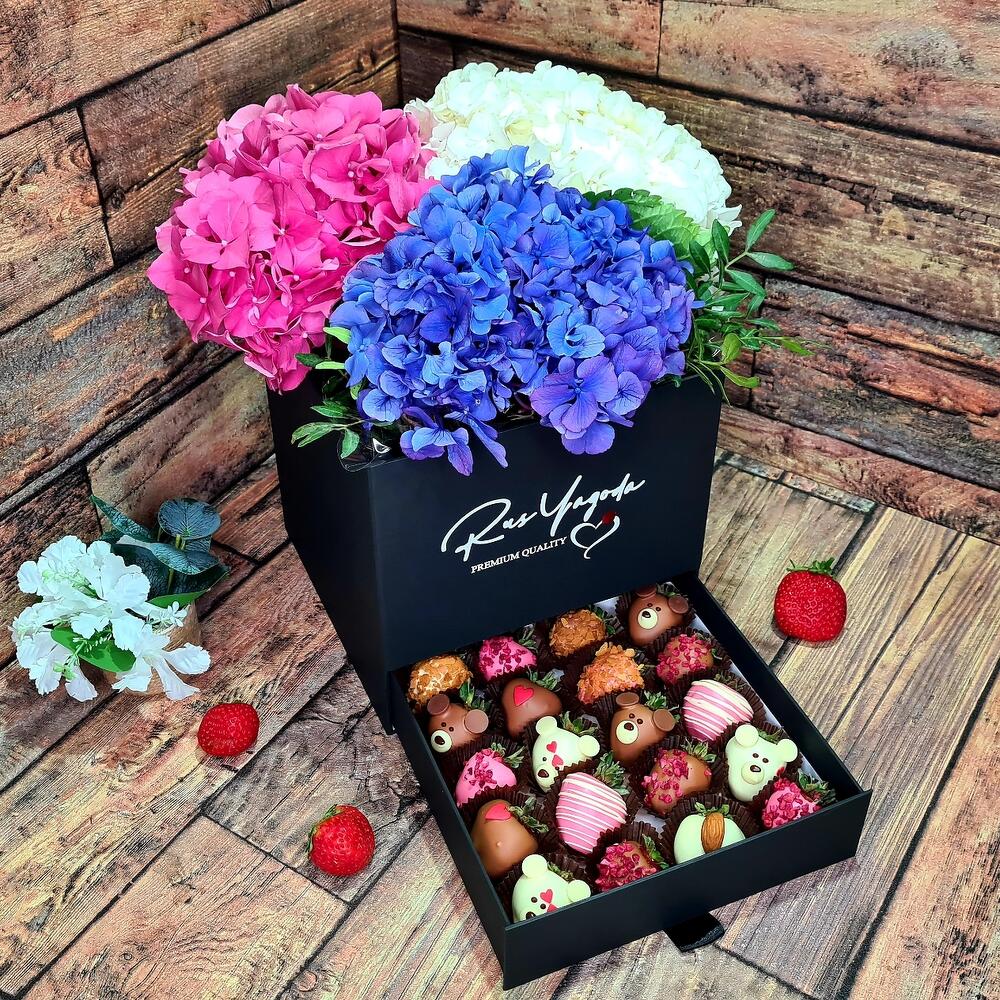 На фото - Букет "Шкатулка Волшебное трио". В составе данной композиции: Гортензия - 3 шт.; Клубника в шоколаде - 20 шт.; Шкатулка - 1 шт.; зелень декоративная пучок - 1 шт.; Пленка прозрачная - 1 шт.; Лента атласная - 2 шт..