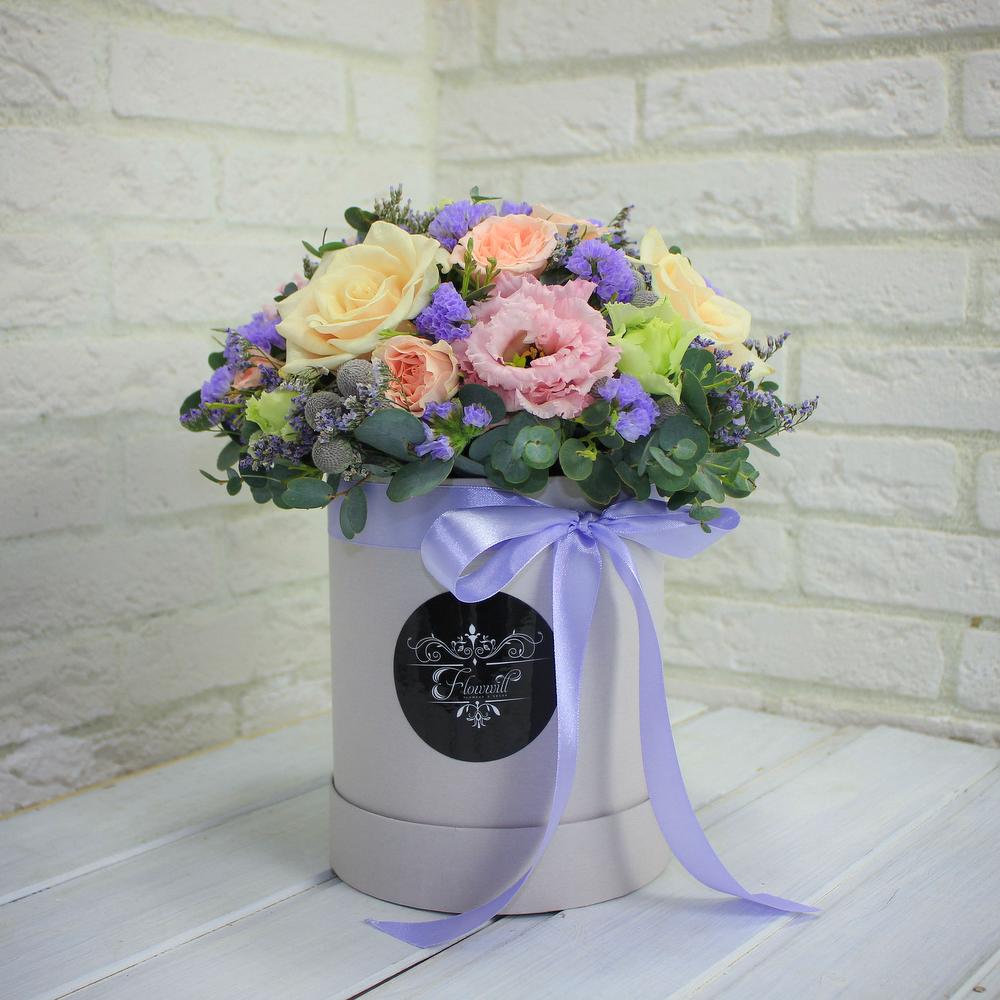 На фото - Букет цветов "Афина" №2. В составе данной композиции: Роза Талея - 2 шт.; Статица - 2 шт.; Роза кустовая - 2 шт.; Бруния - 1 шт.; Эвкалипт - 1 шт.; Лизиантус - 1 шт.; Лимониум - 1 шт.; Цилиндр 14х17 - 1 шт.; Лента - 1 шт..