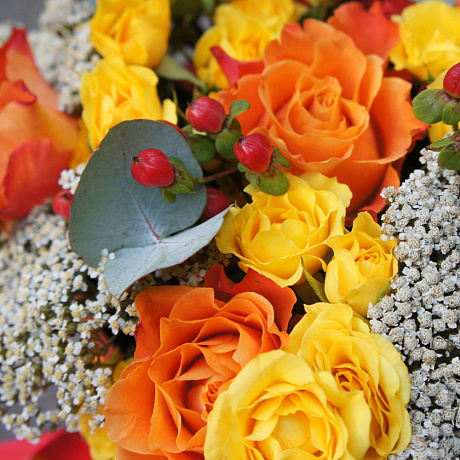 На фото - Букет цветов "Citrus". В составе данной композиции: Роза Марио 40 см - 6 шт.; Роза кустовая Yellow Baby 40 см - 5 шт.; ахиллея белая - 8 шт.; Эвкалипт Синерия - 4 шт.; Гиперикум красный КУСТОВОЙ - 4 шт.; Губка - 1 шт.; Коробка шляпная - 1 шт..