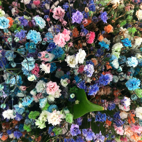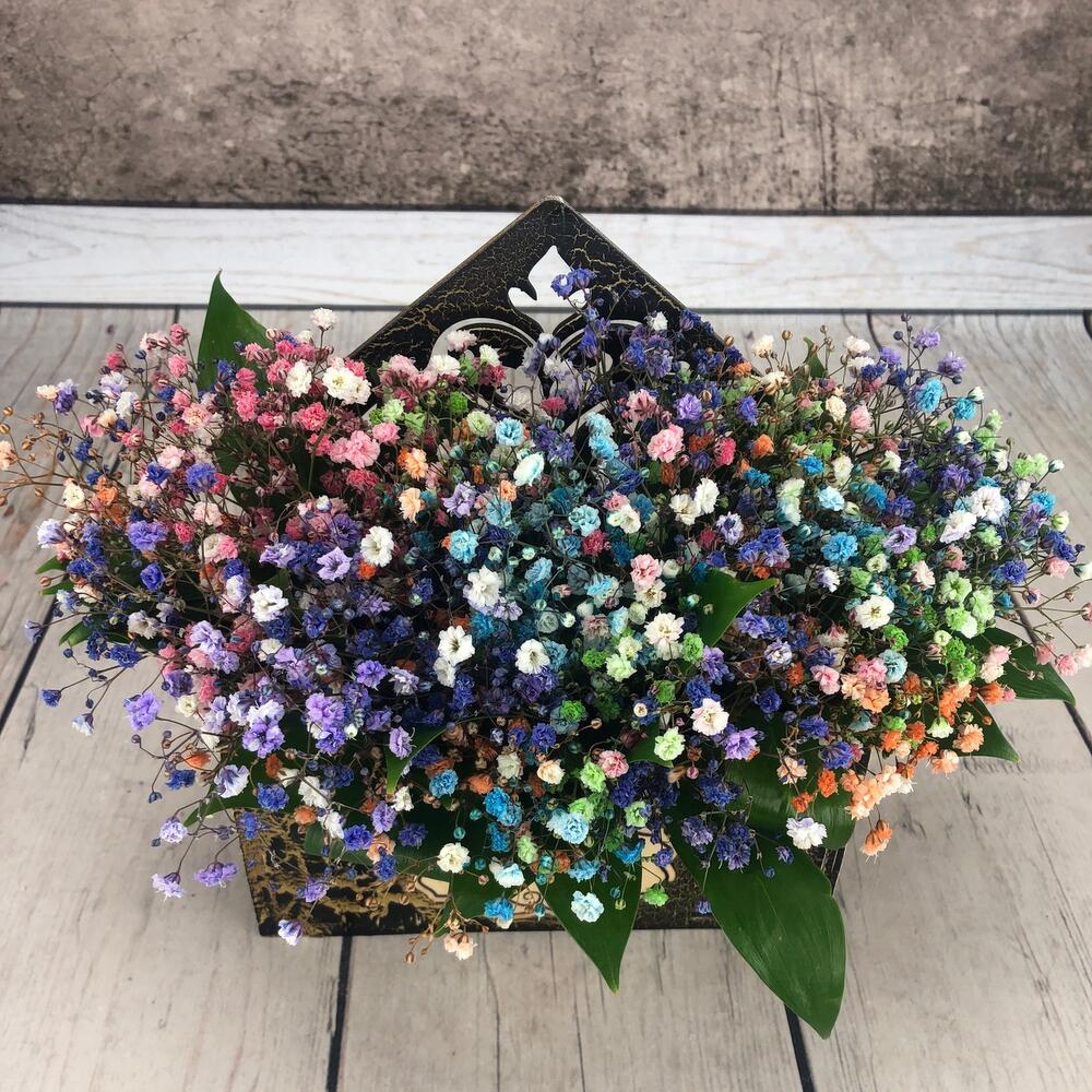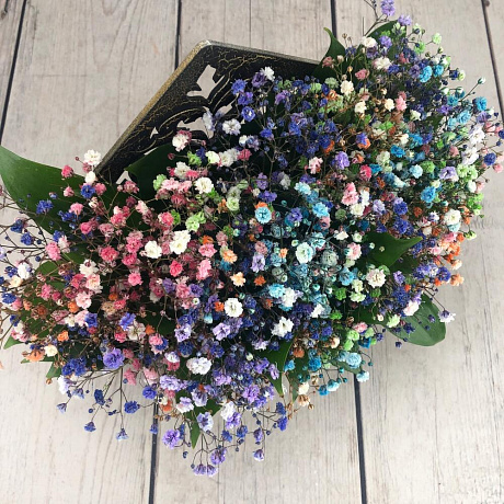 На фото - Букет цветов "Конверт Воздушный". В составе данной композиции: гипсофила цветная микс - 5 шт.; Рускус сочи - 5 шт.; конверт кракелюр - 1 шт..