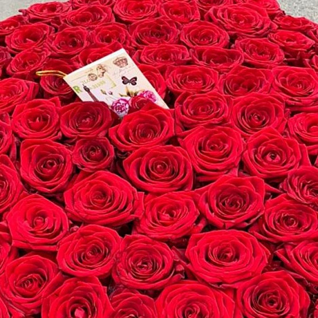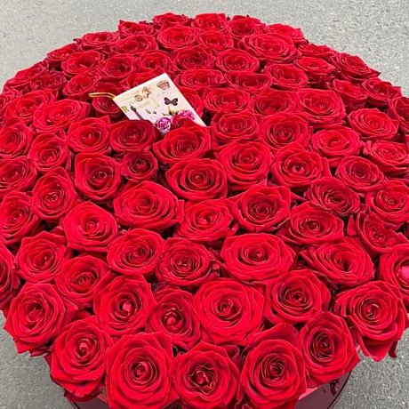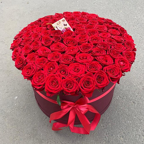 Состав: Красная роза - 101 шт.; Коробка - 1 шт.; Оазис флористический - 6 шт.