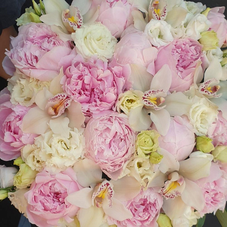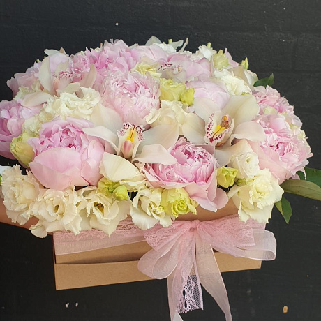 На фото - Букет цветов "Милена". В составе данной композиции: пионы сара бернар - 15 шт.; Эустома - 10 шт.; Орхидея Цимбидиум - 5 шт.; Коробка квадратная - 1 шт.; Оазис флористический - 2 шт.; Упаковка транспортировочная пленка - 1 шт..