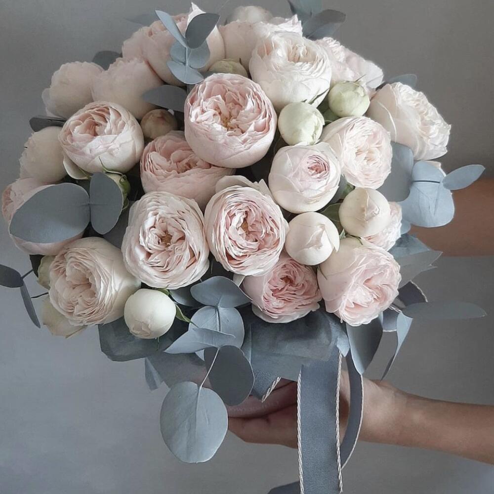 На фото - Букет цветов "Нежность пионов". В составе данной композиции: пионы - 25 шт.; Эвкалипт - 7 шт.; Коробка - 1 шт.; Лента - 1 шт..