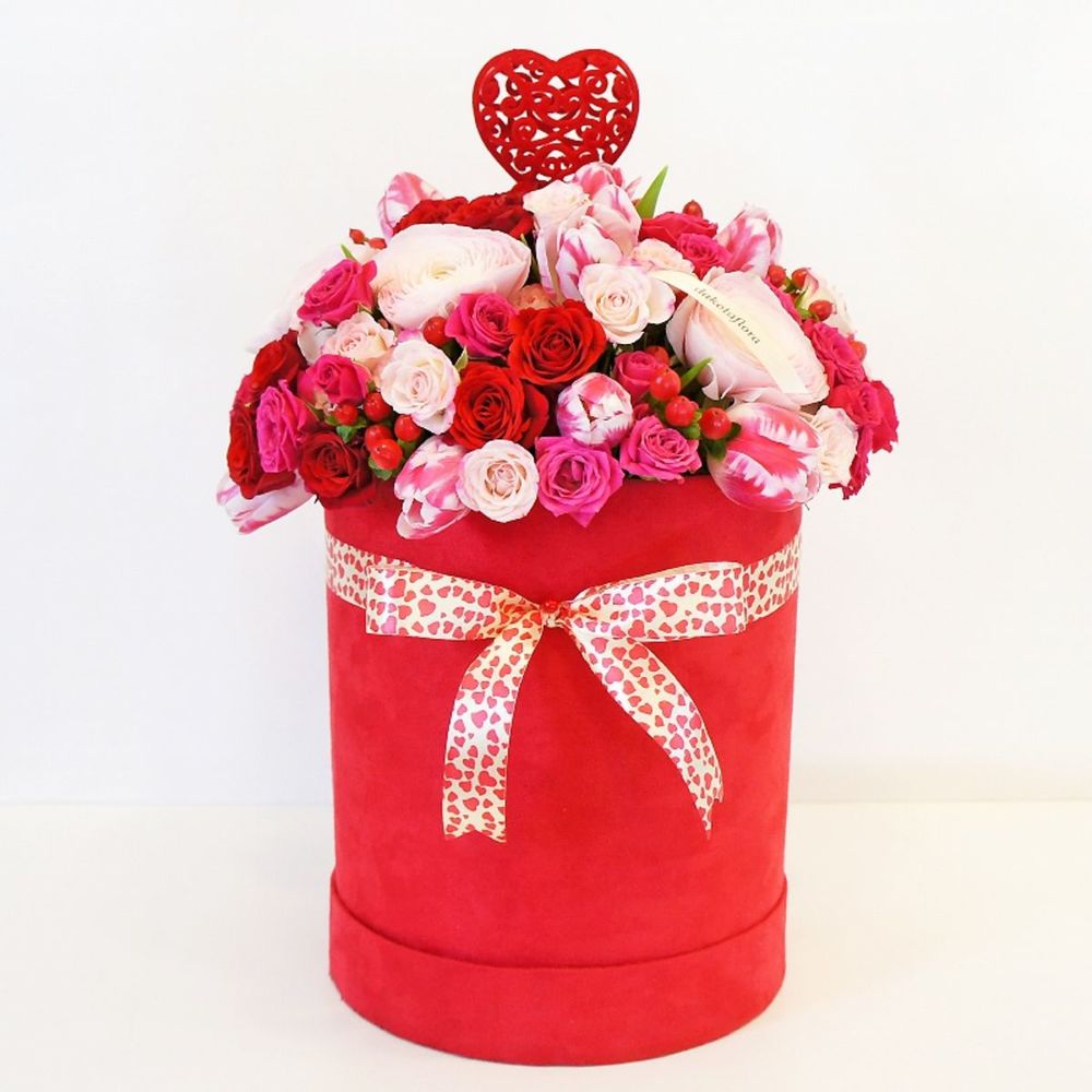 На фото - Букет цветов "От сердца". В составе данной композиции: Вставка сердце - 1 шт.; Ранункулюс - 5 шт.; Тюльпан - 10 шт.; Ягода гиперикум - 10 шт.; Роза кустовая - 19 шт.; Коробка - 1 шт..