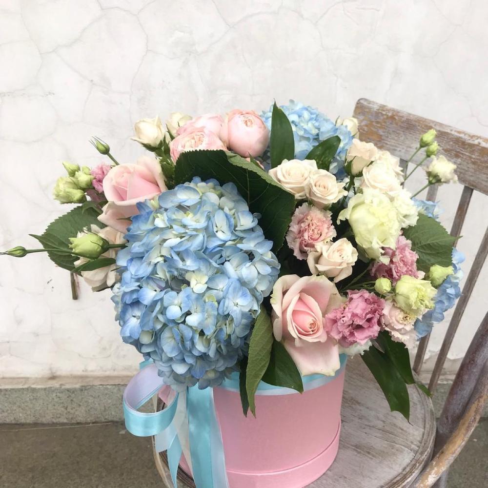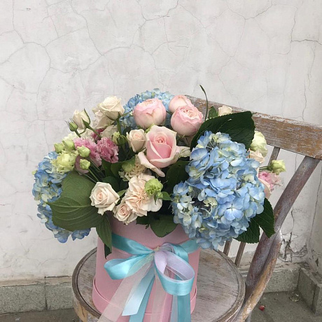 На фото - Букет цветов "Шк01". В составе данной композиции: гортензия колумбия - 3 шт.; Роза кустовая джульетта - 1 шт.; Роза кустовая - 3 шт.; Роза одноголовая - 3 шт.; Диантус сортовой - 3 шт.; Лизиантус алиса пинк - 3 шт..