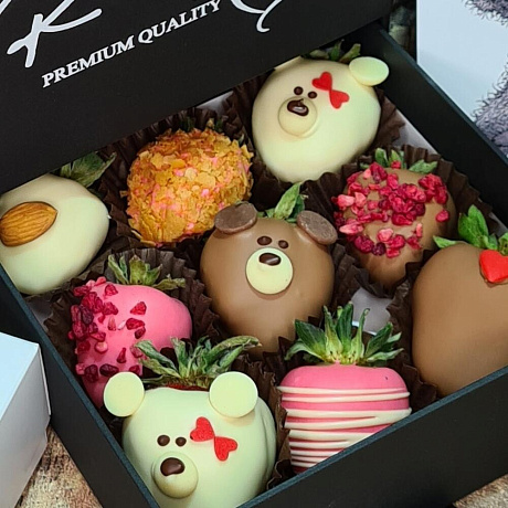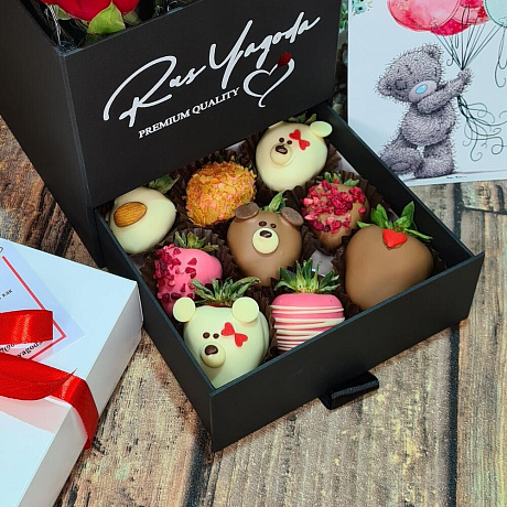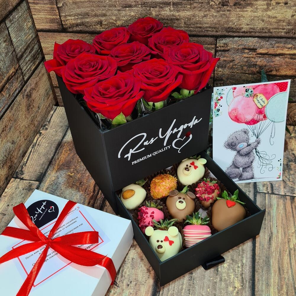 На фото - Букет цветов "Шкатулка Грация". В составе данной композиции: Клубника в шоколаде callebaut (бельгия) - 9 шт.; Роза красная 60 см - 9 шт.; Шкатулка - 1 шт.; Оазис флористический - 1 шт.; Лента атласная - 5 шт.; Пленка прозрачная - 1 шт.; Пакет крафт - 1 шт..