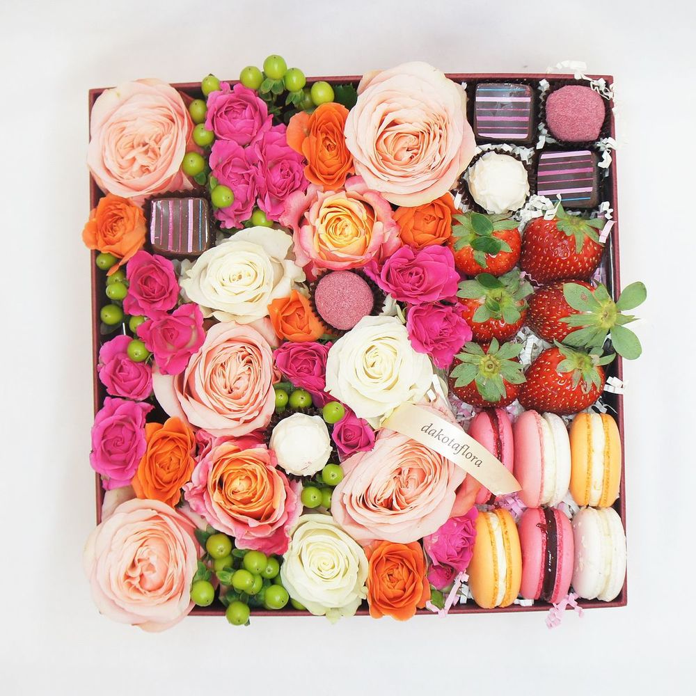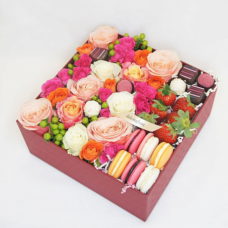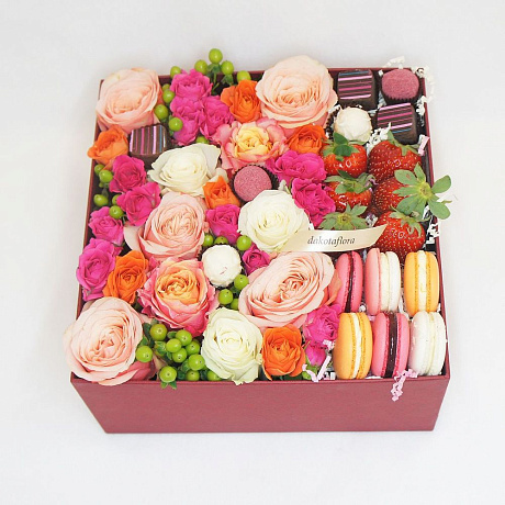 <p>На фото - Букет цветов "Сочные краски". В составе данной композиции: Коробка крафт - 1 шт.; Макарон - 6 шт.; Ягода - 1 шт.; Конфеты - 9 шт.; Гиперикум - 3 шт.; Роза кустовая - 5 шт.; Роза одноголовая - 9 шт..</p> <p>На сайте "Доступная доставка цветов" Вы найдете большой выбор недорогих букетов, цветочных композиций для любого повода.</p> <p>У нас можно заказать Букет цветов "Сочные краски" с доставкой по Москве.</p>