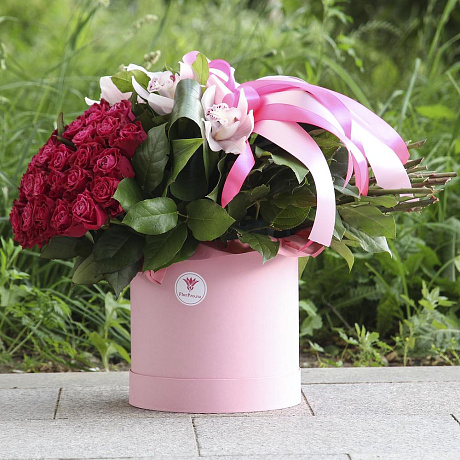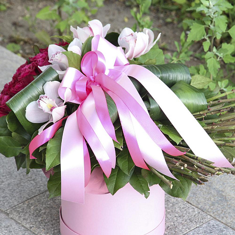 <p>На фото - Букет цветов "Вишневое вдохновение". В составе данной композиции: роза вишневая - 41 шт.; Цимбидиум белый - 5 шт.; Аспидистра - 5 шт.; Салал - 1 шт.; Коробка - 1 шт..</p> <p>На сайте "Доступная доставка цветов" Вы найдете большой выбор недорогих букетов, цветочных композиций для любого повода.</p> <p>У нас можно заказать Букет цветов "Вишневое вдохновение" с доставкой по Москве.</p>