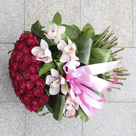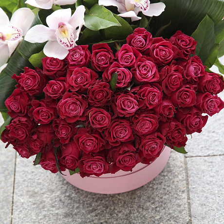 На фото - Букет цветов "Вишневое вдохновение". В составе данной композиции: роза вишневая - 41 шт.; Цимбидиум белый - 5 шт.; Аспидистра - 5 шт.; Салал - 1 шт.; Коробка - 1 шт..