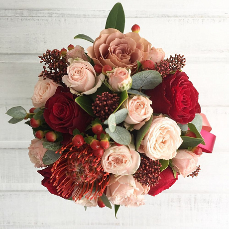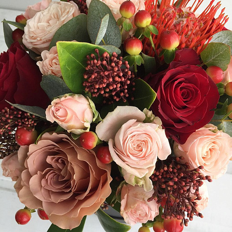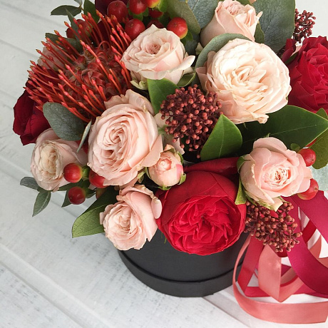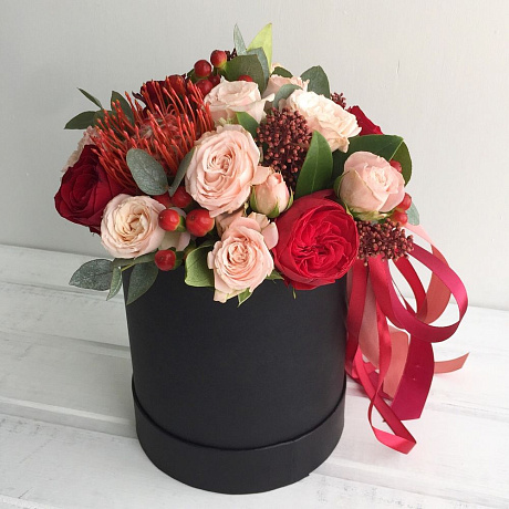 На фото - Букет цветов "Все чувства". В составе данной композиции: Роза - 5 шт.; Роза кустовая - 3 шт.; Скиммия - 3 шт.; Гиперикум - 5 шт.; Эвкалипт - 1 шт.; Коробка-цилиндр - 1 шт..
