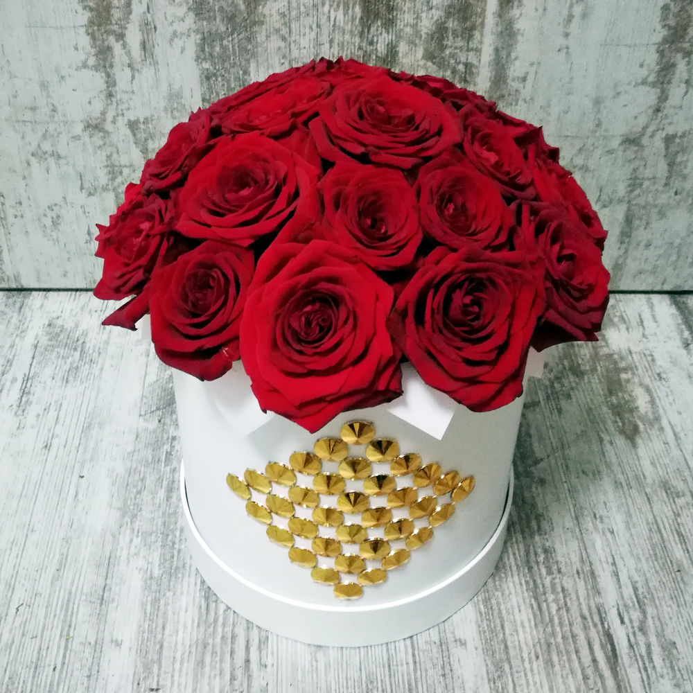 Состав: Роза - 23 шт.; Шляпная коробка - 1 шт.; декор золотые монетки - 1 шт.