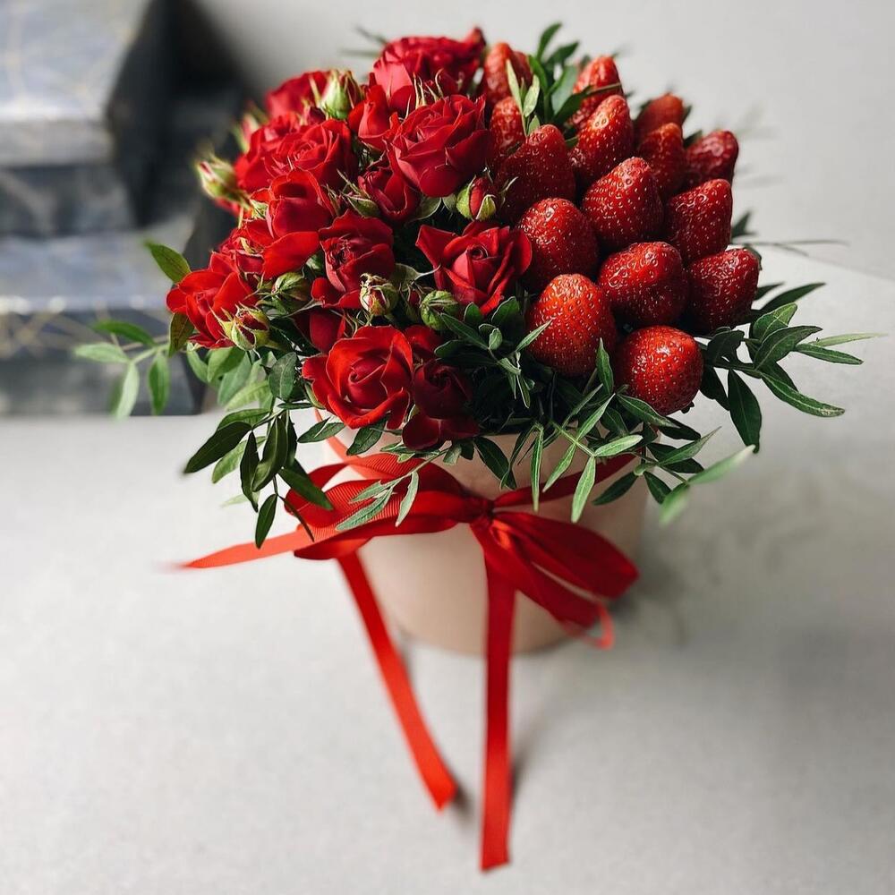 Цветы и клубника в коробке (розы красные)