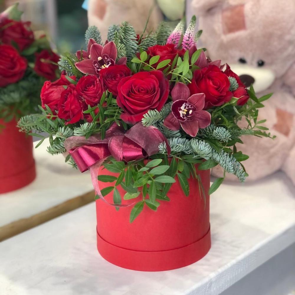 На фото - Цветы в коробке №205. В составе данной композиции: Орхидея Цимбидиум - 3 шт.; Роза одноголовая - 4 шт.; Роза кустовая - 3 шт.; Нобилис - 1 шт.; Вероника - 3 шт.; Писташ - 3 шт.; Коробка шляпная - 1 шт..