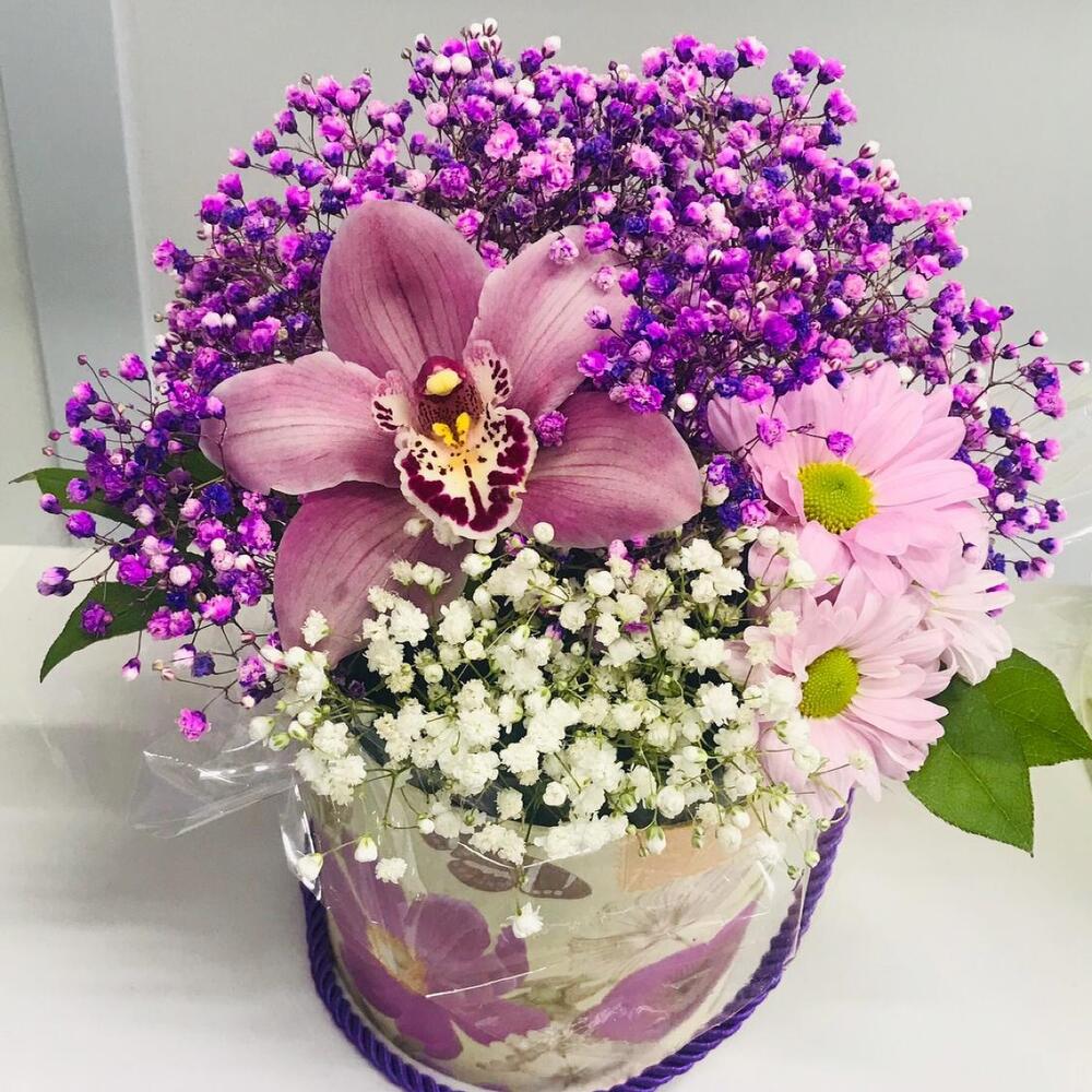 На фото - Цветы в коробке №437. В составе данной композиции: Гипсофила - 7 шт.; ЦИМБИДИУМ - 1 шт.; Коробка - 1 шт.; Оазис - 1 шт..