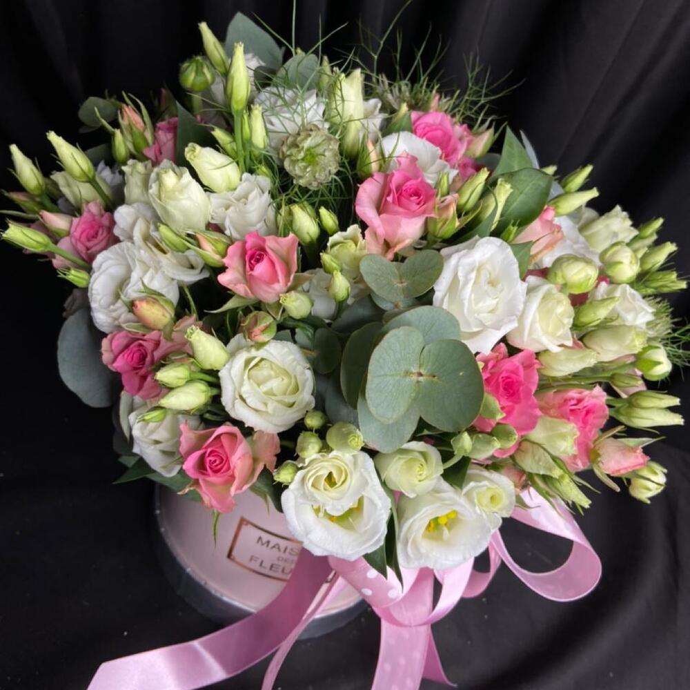 На фото - Цветы в коробке №441. В составе данной композиции: Лизиантус белый - 9 шт.; Роза кустовая малиновая - 5 шт.; 25 коробка розовая - 1 шт.; Оазис флористический - 1 шт.; Эвкалипт - 3 шт.; Лента атласная розовая - 20 шт..