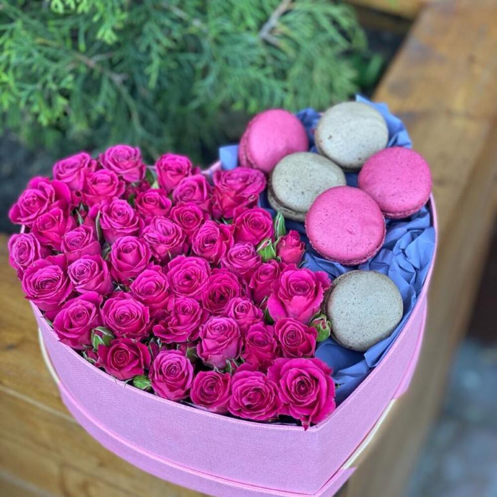 На фото - Цветы в коробке №572. В составе данной композиции: Роза кустовая - 10 шт.; Коробка - 1 шт.; Макарон - 7 шт..
