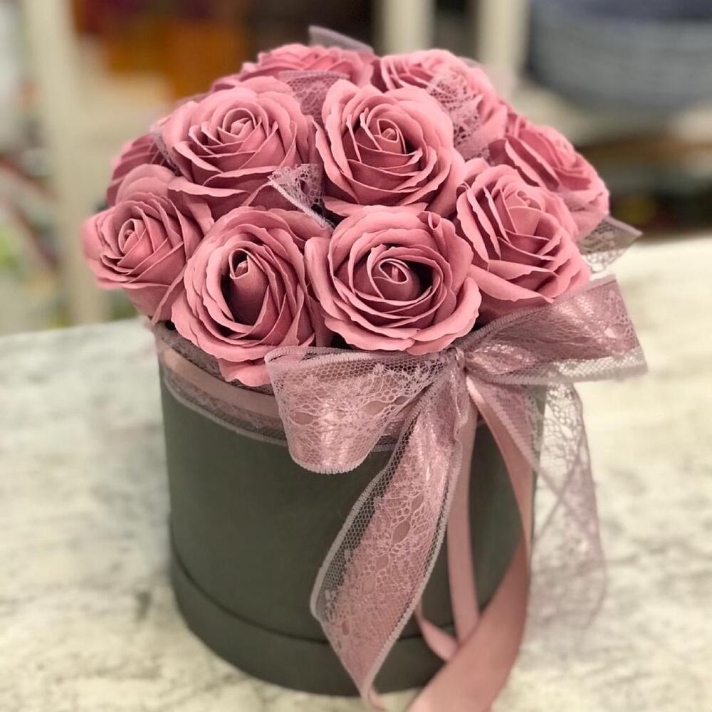 На фото - Цветы в коробке №616. В составе данной композиции: розы искусственные мыльные с запахом - 13 шт..