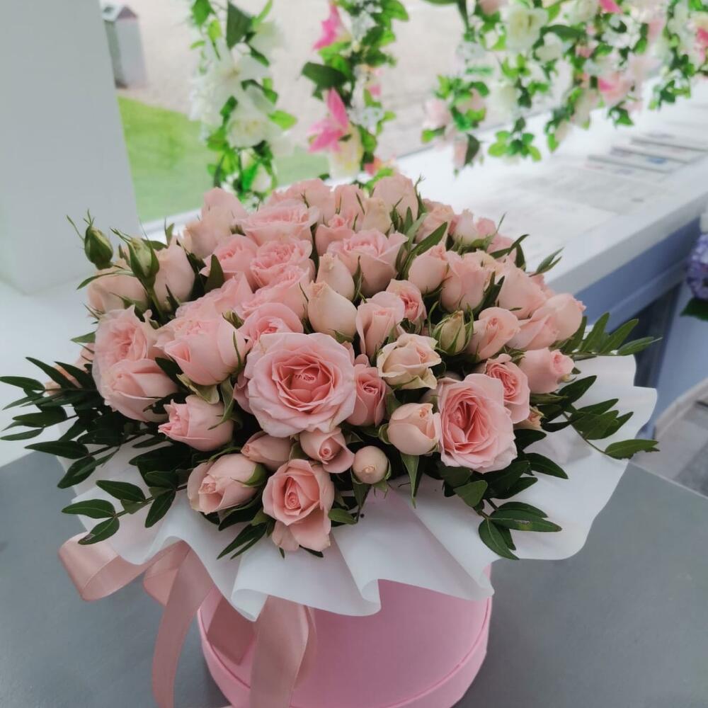 На фото - Цветы в коробке №802. В составе данной композиции: Шляпная коробка - 1 шт.; Оазис флористический - 1 шт.; Роза кустовая - 11 шт.; зелень декоративная - 7 шт.; Лента атласная - 2 шт..