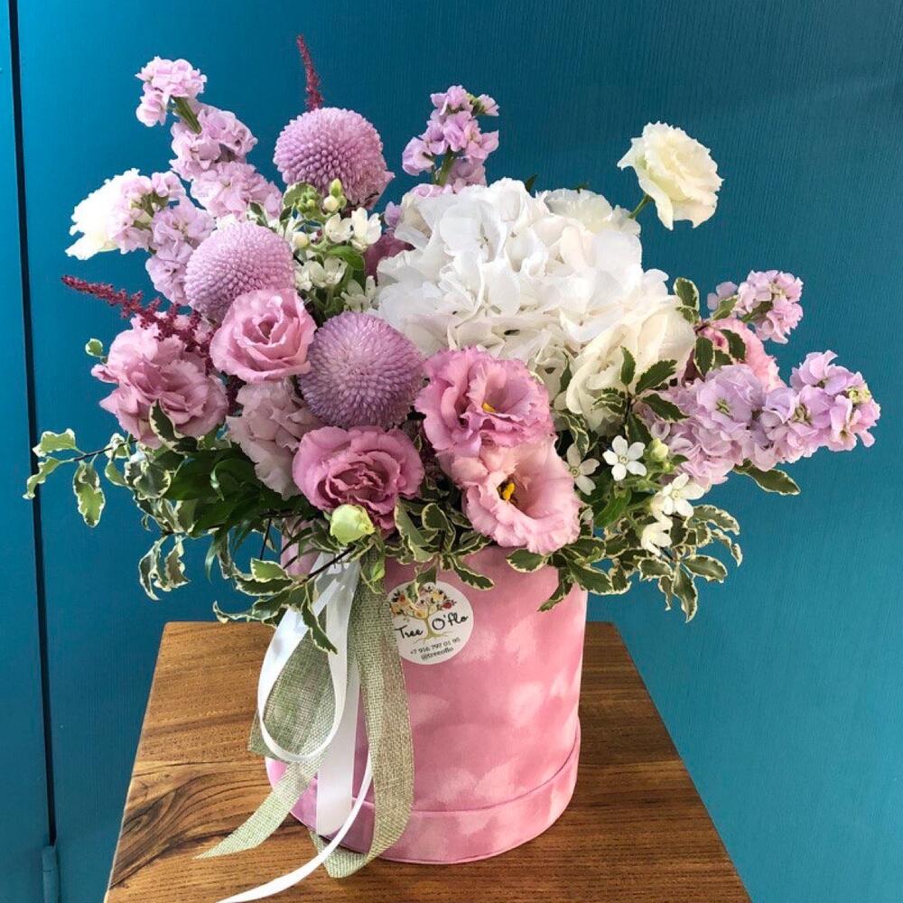 Состав: Гортензия - 1 шт.; Хризантема момоко - 3 шт.; Лизиантус - 5 шт.; Маттиола - 5 шт.; Оксипеталум - 3 шт.; Астильба - 3 шт.; питоспрум - 5 шт.