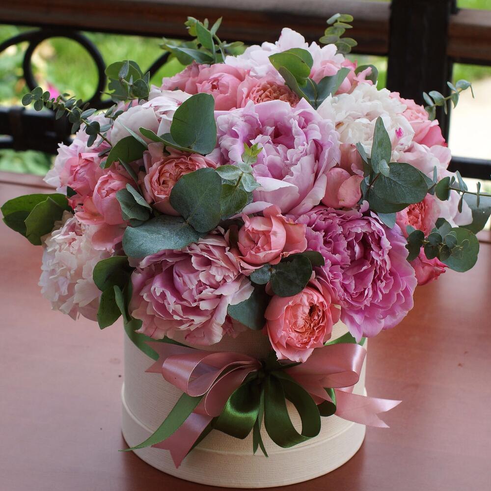 <p>На фото - Цветы в коробке №985. В составе данной композиции: пионы - 9 шт.; Роза кустовая пионовидная - 3 шт.; Эвкалипт - 1 шт.; Шляпная коробка - 1 шт.; Флористическая губка (оазис) - 1 шт.; Лента - 2 шт..</p> <p>На сайте "Доступная доставка цветов" Вы найдете большой выбор недорогих букетов, цветочных композиций для любого повода.</p> <p>У нас можно заказать Цветы в коробке №985 с доставкой по Москве.</p>