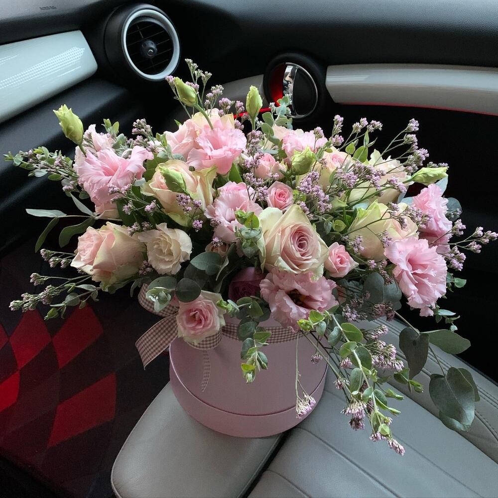 На фото - Цветы в шляпной коробке №169. В составе данной композиции: Коробка шляпная - 1 шт.; Эвкалипт - 1 шт.; Роза кустовая - 4 шт.; Роза розовая - 9 шт.; Лизиантус - 5 шт.; Лимониум - 3 шт..