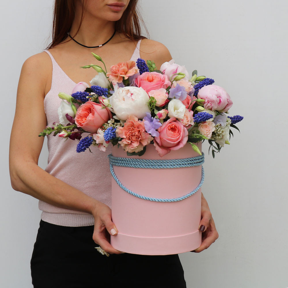 На фото - Букет цветов "Каприз" №170. В составе данной композиции: Пион - 5 шт.; Пионовидная роза - 9 шт.; Кустовая роза - 5 шт.; Мускари - 10 шт.; Диантус - 5 шт.; Коробка-цилиндр - 1 шт.; Шнурок - 1 шт..