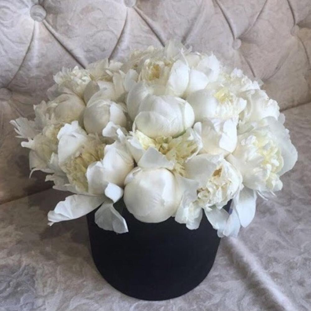 На фото - Коробка белых пионов. В составе данной композиции: Пион белый - 25 шт.; Коробка шляпная - 1 шт.; Оазис флористический - 1 шт..