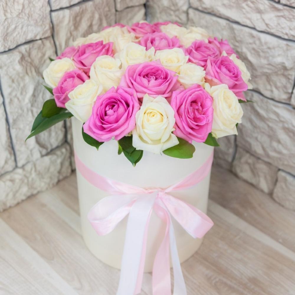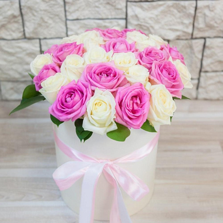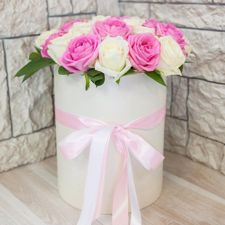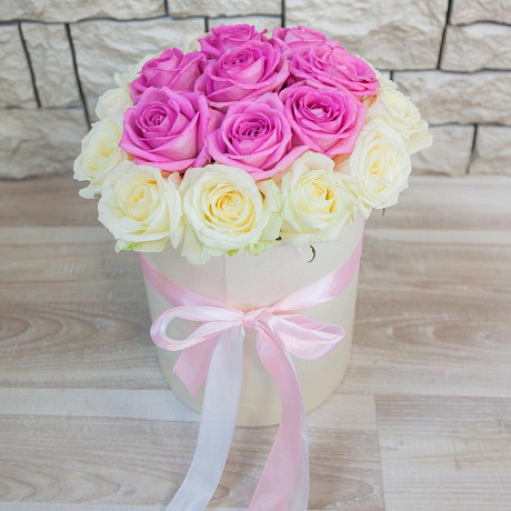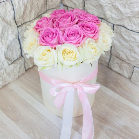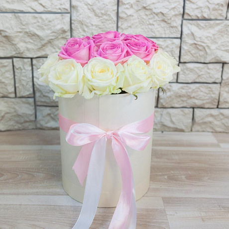 На фото - Коробка из 19 белых и розовых роз. В составе данной композиции: Роза розовая - 9 шт.; Роза белая - 10 шт.; Коробка шляпная - 1 шт.; Оазис флористический - 1 шт.; Лента атласная - 1 шт.; Рускус - 10 шт..