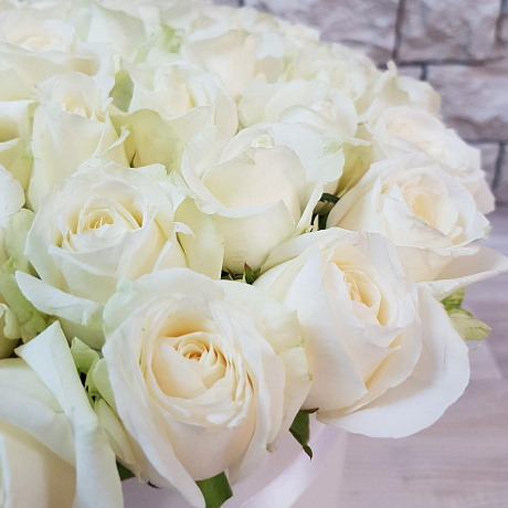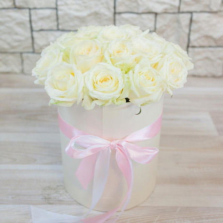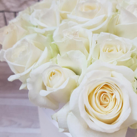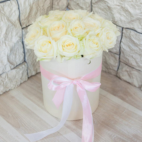 На фото - Коробка из 19 белых роз. В составе данной композиции: Роза белая - 19 шт.; Коробка шляпная - 1 шт.; Лента атласная - 1 шт.; Оазис флористический - 1 шт..