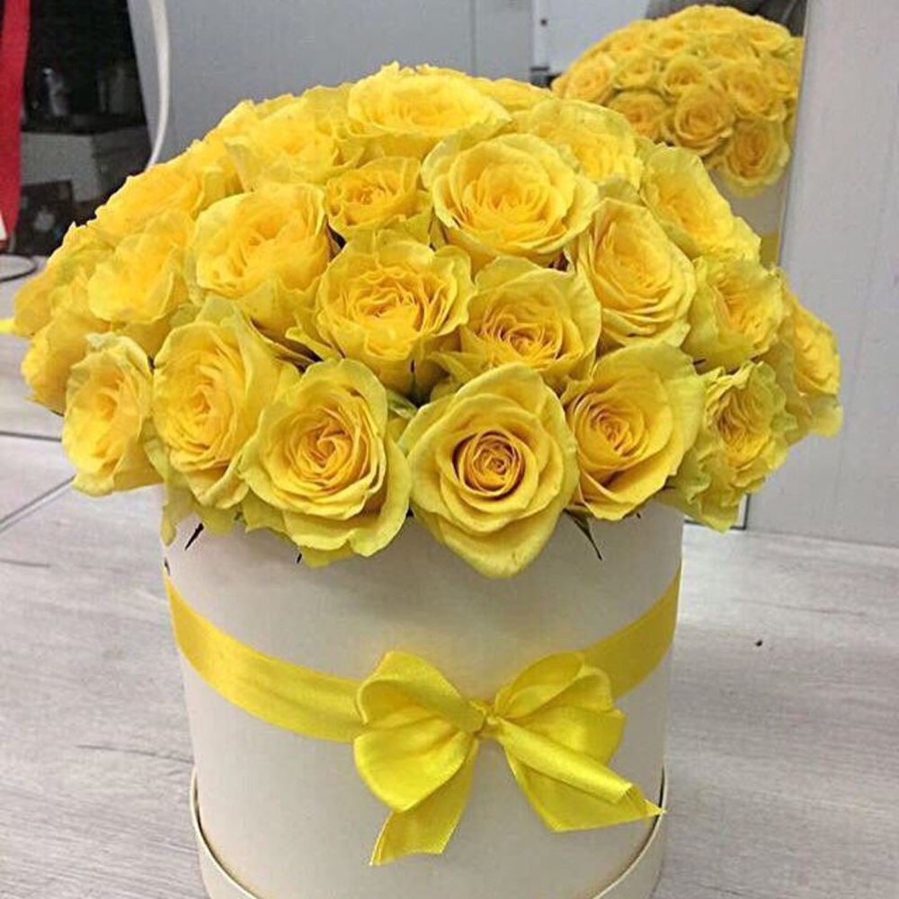 На фото - Коробка из 35 желтых роз вида Илиос. В составе данной композиции: Роза желтая вид илиос - 35 шт.; Шляпная коробка - 1 шт.; Лента - 1 шт..