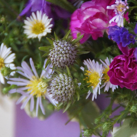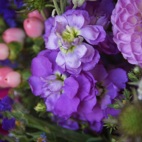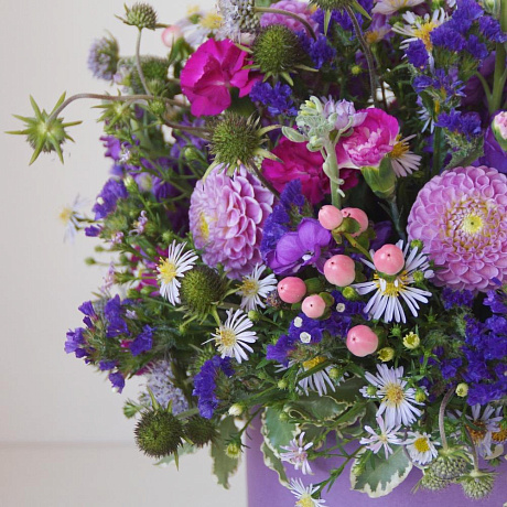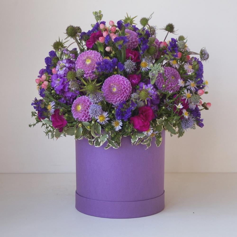 На фото - Коробка с цветами Luxury Flowers Мечты о Провансе. В составе данной композиции: Маттиола - 9 шт.; Гиперикум - 10 шт.; Статица - 10 шт.; Диантус кустовой - 10 шт.; зелень декоративная - 1 шт.; Коробка шляпная - 1 шт.; Оазис флористический - 2 шт..