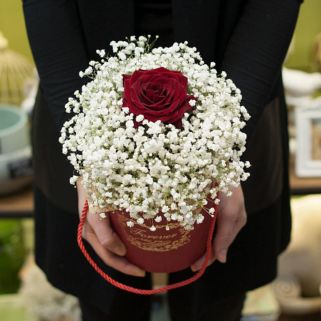 Состав: Гипсофила - 9 шт.; Роза - 1 шт.; Коробка - 1 шт.