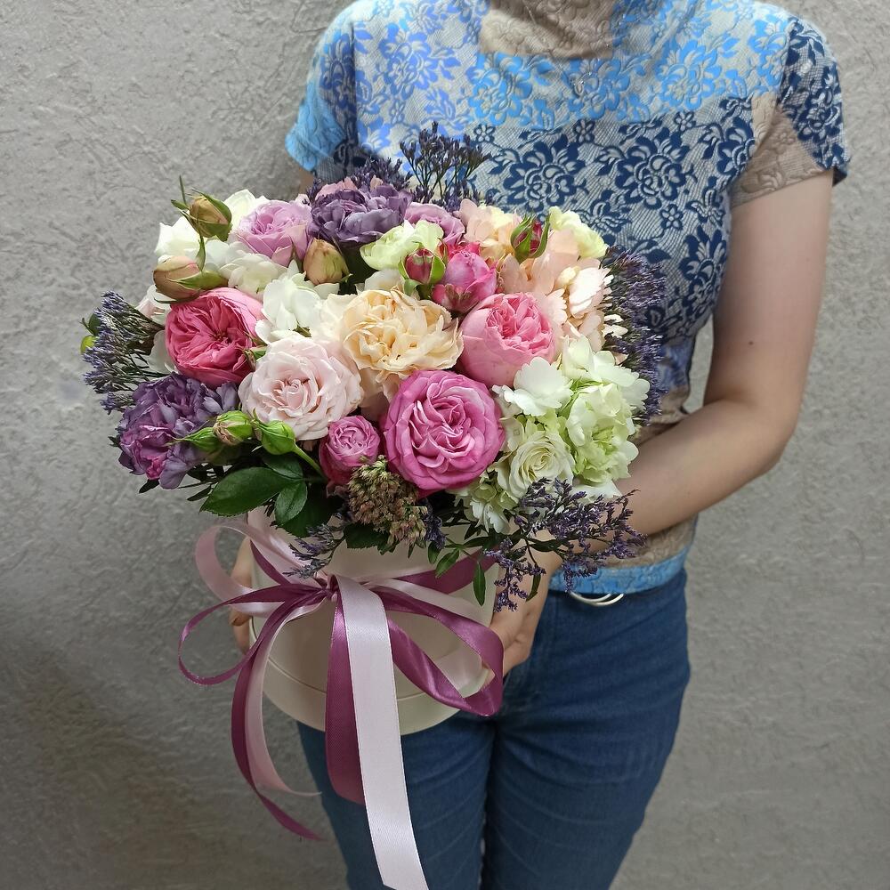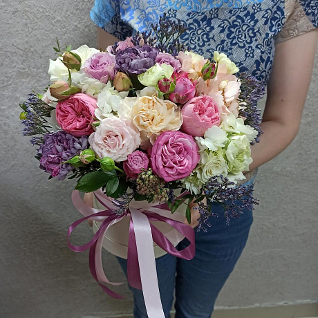 На фото - Коробка с красивыми цветами. В составе данной композиции: Гортензия мини - 3 шт.; Диантус - 4 шт.; Роза пионовидная - 3 шт.; Роза кустовая - 4 шт.; Роза - 2 шт.; Диантус кустовой - 2 шт.; Лимониум - 2 шт.; Седум - 2 шт.; Зелень - 3 шт.; Оазис флористический - 1 шт.; Коробка - 1 шт..