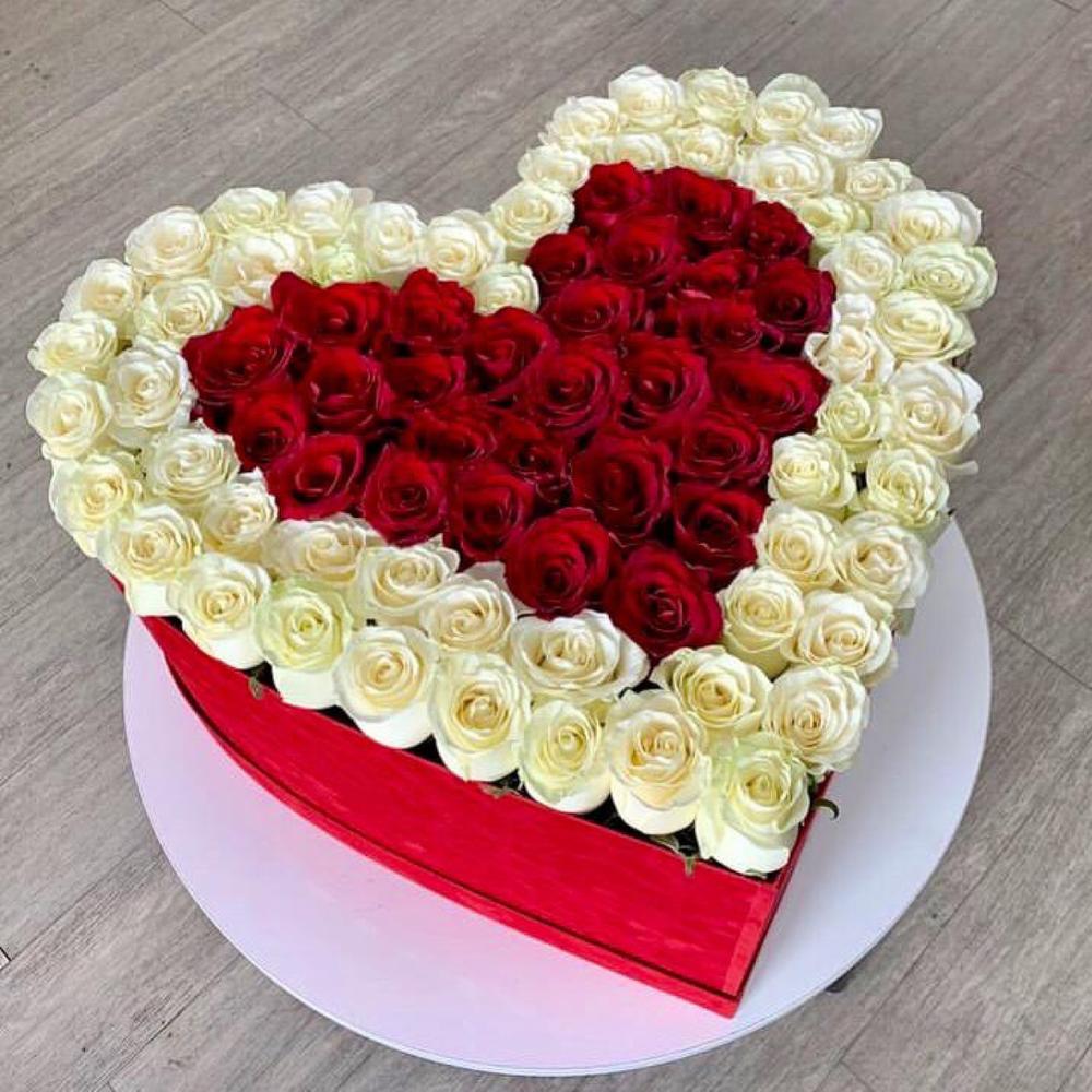 На фото - Коробка сердце красное с белым. В составе данной композиции: Роза белая аваланж - 60 шт.; Роза красная red naomi - 29 шт.; Коробка сердце большая - 1 шт..