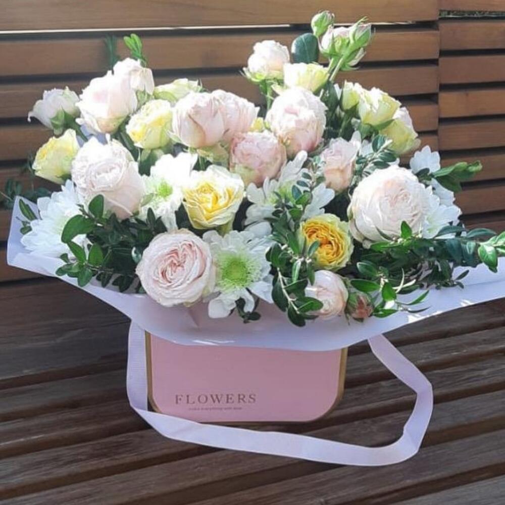 Белая шкатулка с кустовой пионовидной розой