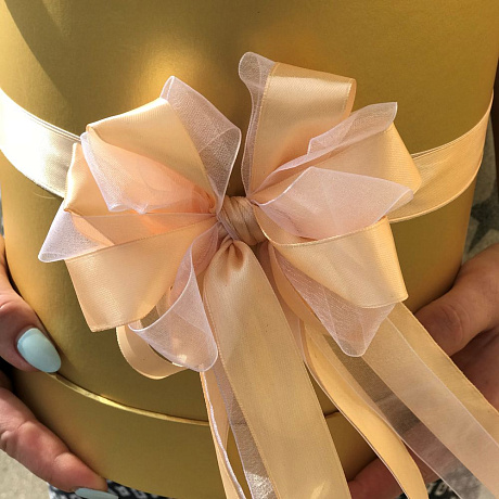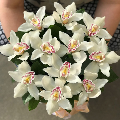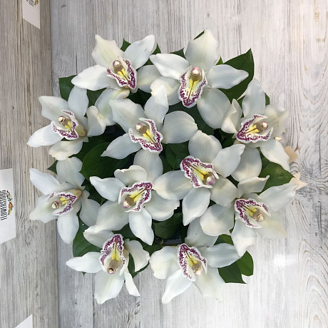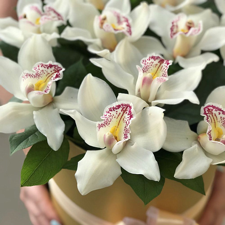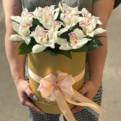 На фото - Коробки с цветами. Орхидея. Цимбидиум. N145. В составе данной композиции: ЦИМБИДИУМ - 11 шт.; Коробка золотая 20на25 - 1 шт.; Салал - 5 шт..
