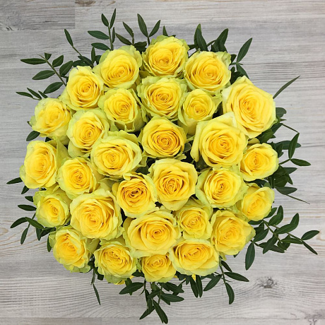 Состав: Желтая роза 50 см - 29 шт.; Писташ - 2 шт.; Коробка черная 20на25 - 1 шт.