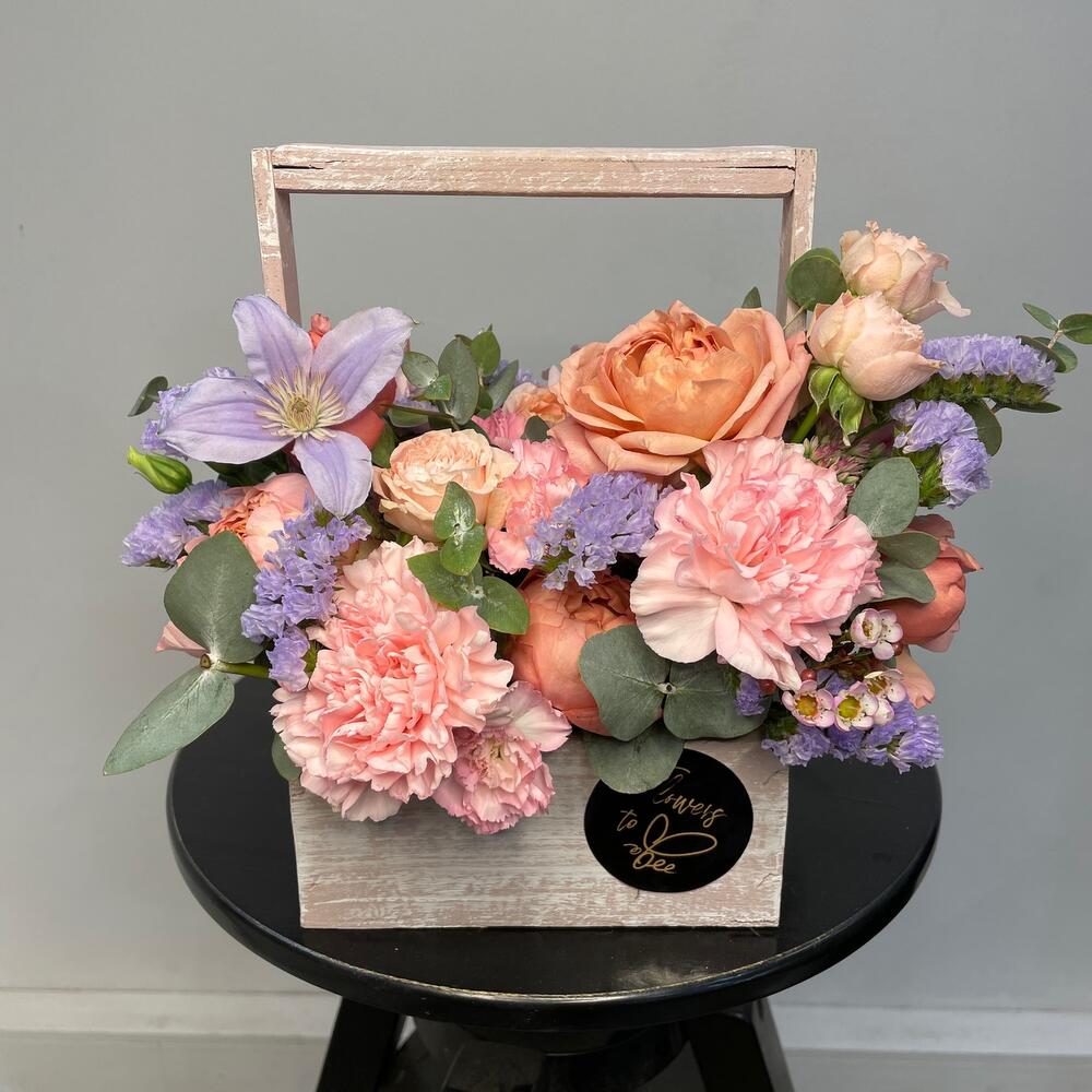 Состав: Роза кустовая пионовидная джульетта - 2 шт.; Роза кустовая пионовидная бомбастик - 1 шт.; Диантус сортовой - 2 шт.; Диантус кустовой - 2 шт.; Клематис - 1 шт.; Роза сортовая - 1 шт.; Лизиантус - 2 шт.; Статица - 3 шт.; Эвкалипт - 3 шт.; Седум - 2 шт.; Хамелациум - 1 шт.; Писташ - 1 шт.; Ящик деревянный ручной работы - 1 шт.; наклейка фирменная - 1 шт.; Оазис флористический - 1 шт.
