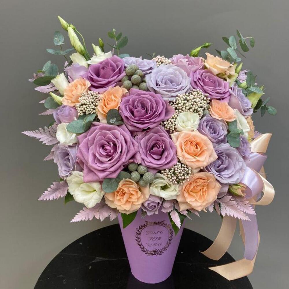 На фото - Букет цветов "Мечта" №177. В составе данной композиции: Коробка шляпная - 1 шт.; Кустовая роза - 5 шт.; Озотамнус - 1 шт.; Бруния - 1 шт.; зелень декоративная - 3 шт..