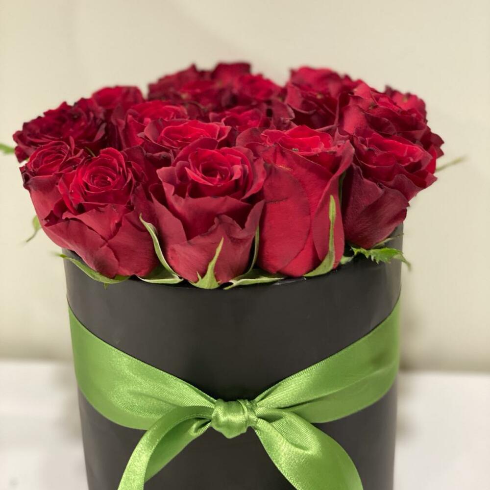 На фото - Букет цветов "Милашка" №164. В составе данной композиции: Роза - 21 шт.; Коробка - 1 шт.; Лента атласная - 1 шт..