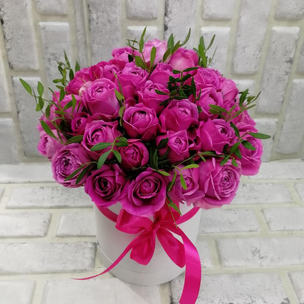 На фото - Букет цветов "Миссти баблз" №161. В составе данной композиции: Пионовидная кустовая роза - 25 шт.; Шляпная коробка - 1 шт.; Флористический оазис - 2 шт.; Атласная лента - 1 шт.; зелень фисташка - 8 шт..