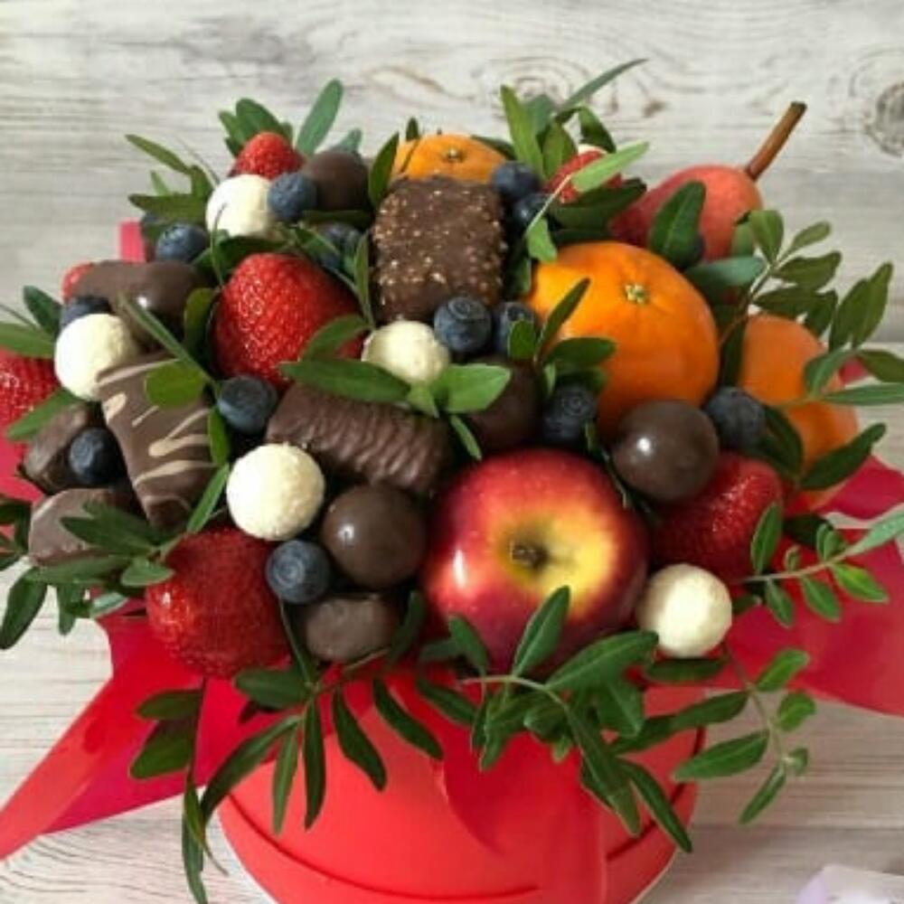 На фото - Букет цветов "Натали" №162. В составе данной композиции: Коробка шляпная - 1 шт.; Клубника - 10 шт.; коныеты - 400 гр.; Груша - 1 шт.; Яблоко - 1 шт.; Мандарин - 3 шт..