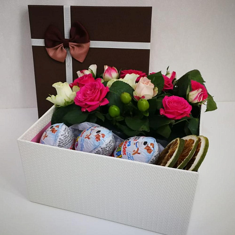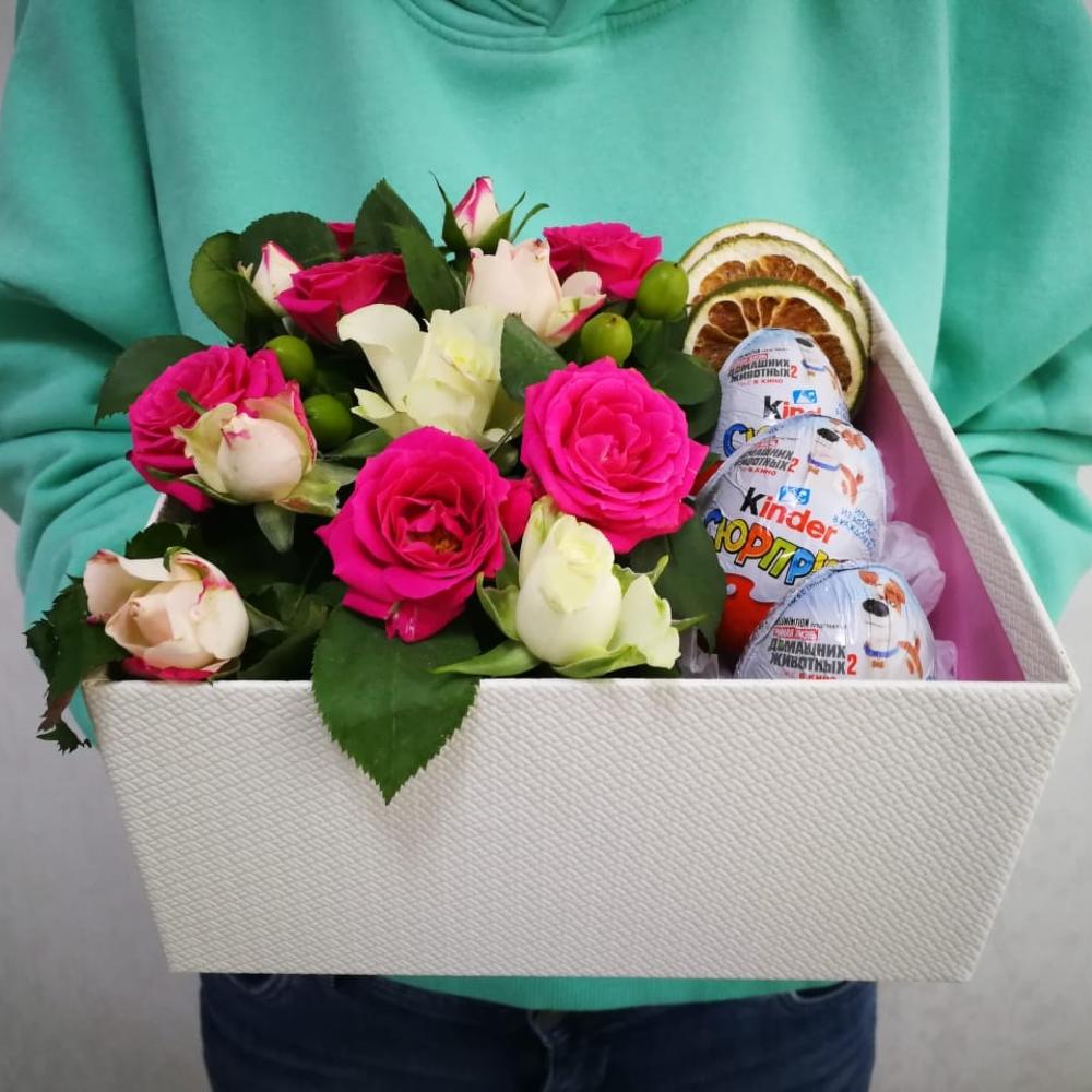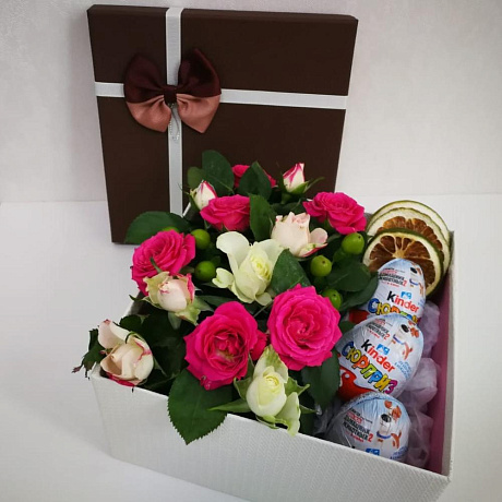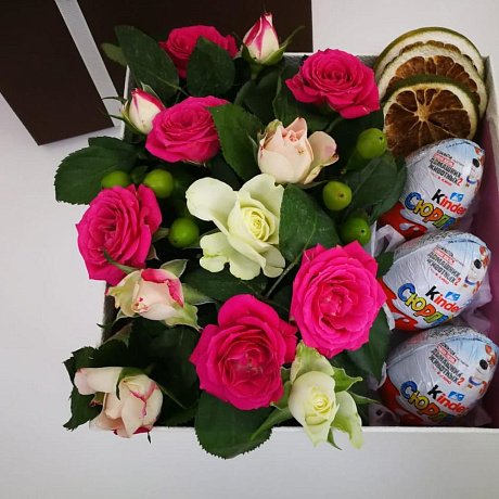 На фото - Букет цветов "Нежная радость" №160. В составе данной композиции: Роза кустовая - 13 шт.; Гиперикум - 7 шт.; яйца киндер - 3 шт.; апельсин сушенный - 3 шт.; Открыточка с вашими пожеланиями - 1 шт.; Коробка квадратная - 1 шт..