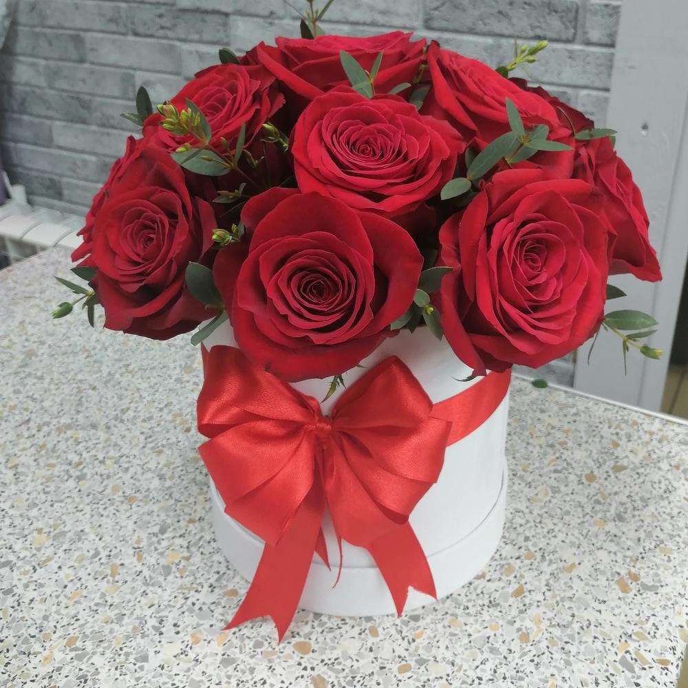 Состав: Роза Колумбия 50 см - 15 шт.; зелень декоративная пучок - 1 шт.; Оазис - 1 шт.; Коробка шляпная - 1 шт.; Лента атласная - 1 шт.