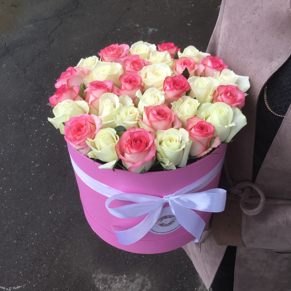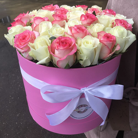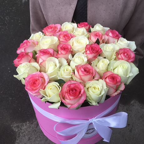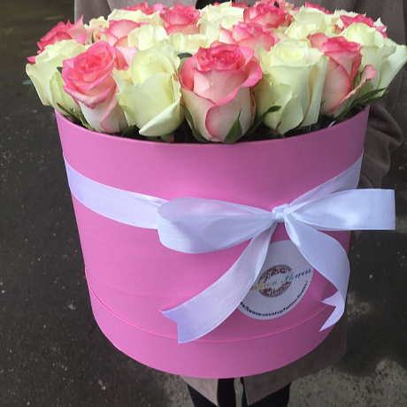 Состав: Роза Аваланж - 15 шт.; Роза розовая - 14 шт.; Коробка шляпная - 1 шт.; Лента атласная - 1 шт.; Губка флористическая - 3 шт.